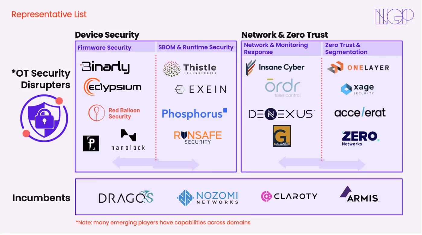 Although OT security is rapidly maturing, several large incumbents have already emerged. Early leaders like Vdoo (acquired by JFrog), Nozomi Networks, Claroty, and Dragos validated the scale of the market opportunity, but their solutions have primarily relied on passive, network-level monitoring. Like doctors limited to observing surface-level symptoms, these incumbents lack deeper diagnostic capabilities. This gap has created an opening for the next generation of startups who specialize in active, device-level inspection and prevention.