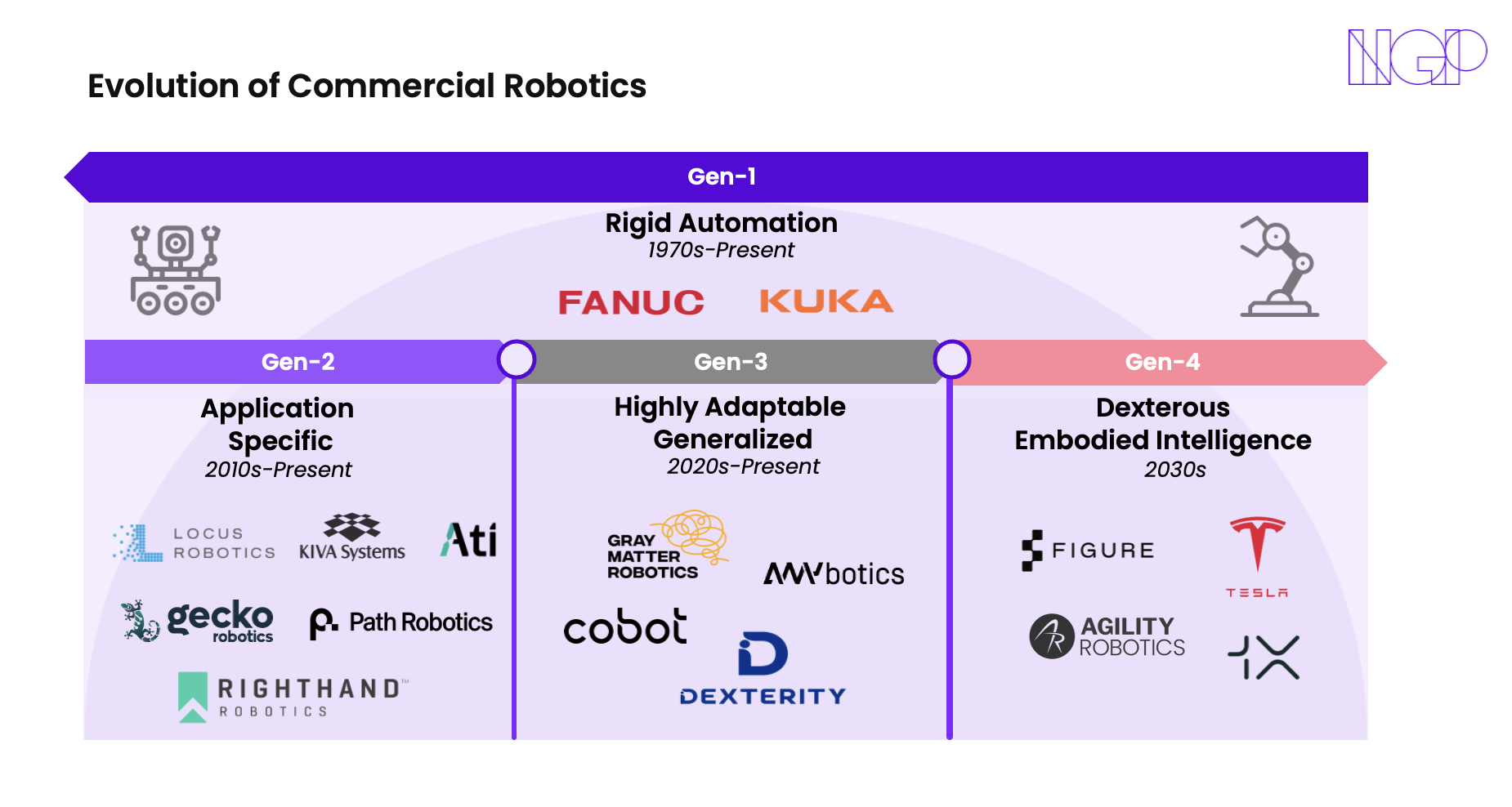 Humanoids represent the latest chapter in a modern robotics era that traces back to the early 1970s. Companies like FANUC and KUKA developed quickly behind products like Unimate, the world’s first successful industrial robot, innovating and scaling in the first innings of the industry. The foundations set in this Rigid Automation phase power manufacturing today. The space evolved steadily until democratization of sensing and compute opened the door for high-performance Application Specific robots starting in the 2010s. Many of these systems leveraged either advanced perception and navigation to enable semi- or fully autonomous motion or performed pick-and-place tasks with off-the-shelf robot arms. We recently entered the generation of Highly Adaptable, Generalized systems, featuring flexible and collaborative robots including offerings from NGP portfolio companies like GrayMatter Robotics and ANYbotics. Systems from all these three generations co-exist today and are not static; they increasingly offer AI-enabled functionality.