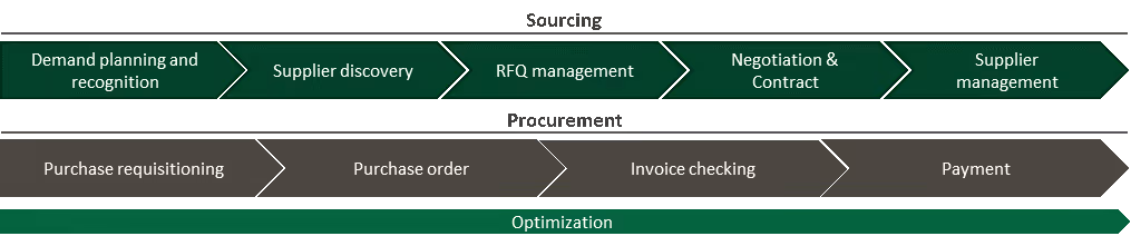 Procurement can be split into two broad categories: Sourcing and Procurement. Sourcing starts with identifying requirements and discovering suppliers, then moves on to selection, closing, and managing the supplier relationships. Procurement is more process-driven and repetitive in nature, and includes tasks ranging from purchase requests to invoice management and payments. Analytics and spend optimization apply to both categories.