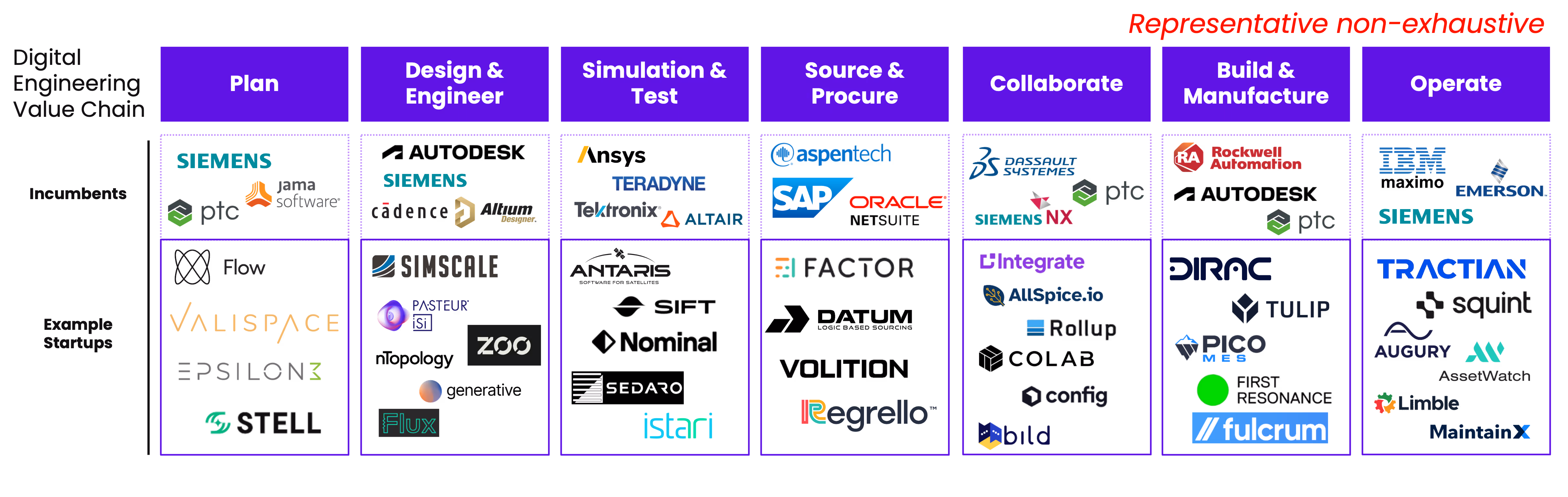 - Target Critical Use Cases & Go Deep: Solve for critical use cases with a clear ROI. Whether it’s collaboration bottlenecks, BOM optimization, or testing/simulation challenges, winners will need to be ten times better than the status quo. As much as investors scream “platform,” focus on a specific area of the value chain will be key to dislodging scaled incumbents. The market runs with the herd, so once you’re in, the chances of moving horizontally to capture more value increases precipitously.